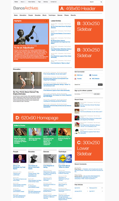 Through its clean, eye-catching format and different presentation options, DanceArchives is a strong goal-oriented advertising platform. This is an excellent time to get in on the ground floor while number of impressions is rapidly increasing. Prices will increase as traffic grows. Lock in your rates to a 6-month term to protect your pricing.